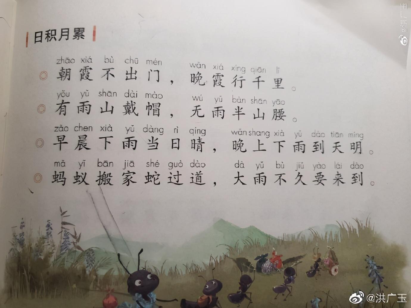 其中有一篇课文叫《要下雨了》,就用童话的方式——蚂蚁说“要下雨了,正忙着搬东西”,后面的日积月累还介绍了“蚂蚁搬家蛇过道,大雨不久要来到”。