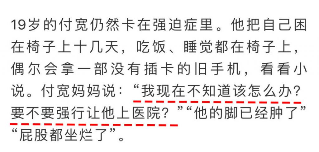 可想而知的是,付宽的情况反而一再恶化。如今他几乎丧失社交能力,限于自闭状态无法自拔,更抗拒与母亲交流。