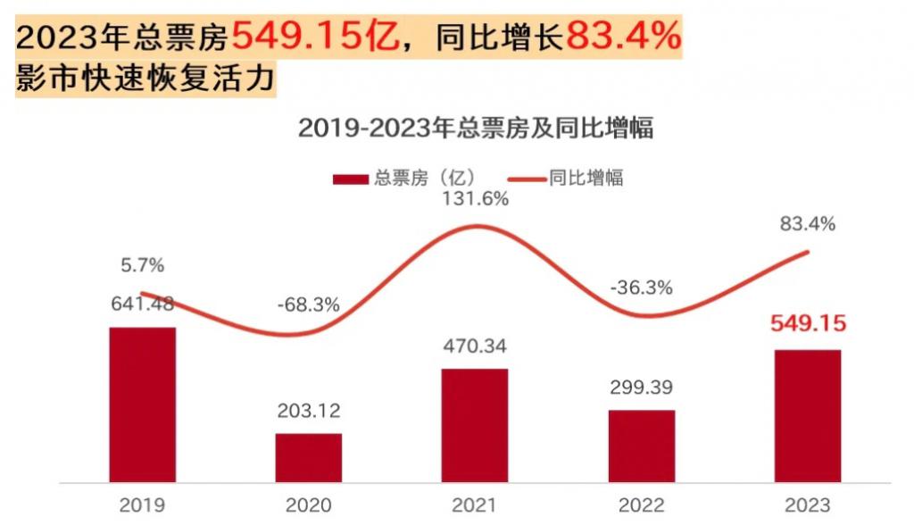 2023 年中国电影票房达到了 549.15 亿,同比增长 83.4%,终于摆脱了三年疫情的阴霾,已经恢复到了 2017 年的水准。