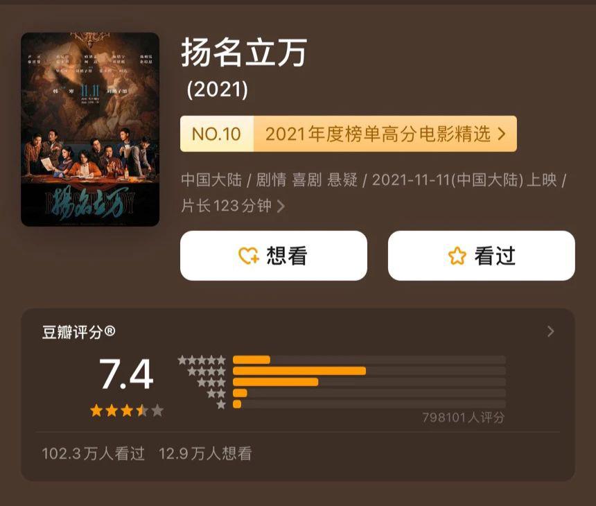 小空间悬疑剧本杀喜剧《扬名立万》也有 9 亿,但同类型《不速来客》票房未过亿,《戏杀》票房甚至不足千万。