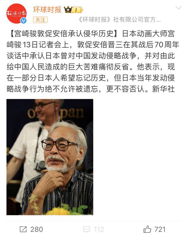 2013 年,《起风了》上映时,宫崎骏发布了一则声明,批评安倍晋三为代表的政客抹除历史的行为。