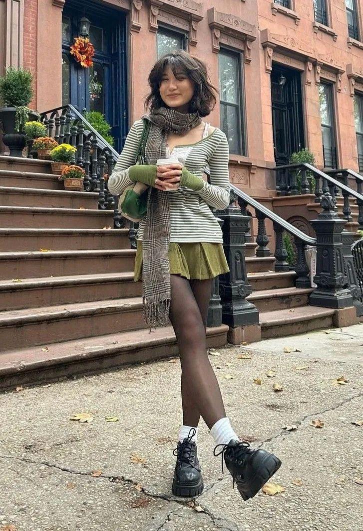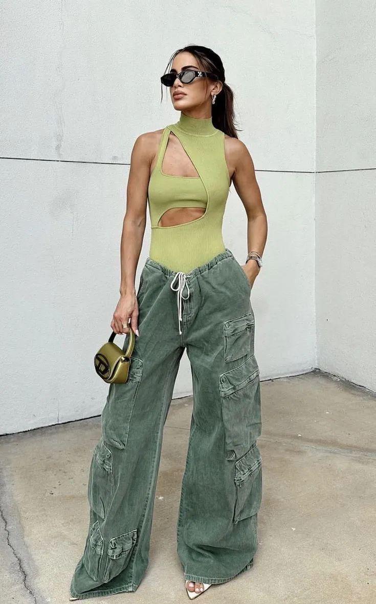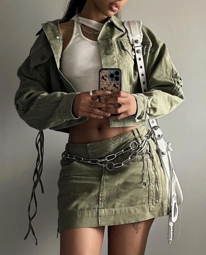 有一种"鲜艳"颜色穿上也可以有废土风,就是迎接春夏的复古色调——军绿、墨绿,低饱和的绿色调和不同的面料材质互相呼应,将废土美学提升到了新水准。
