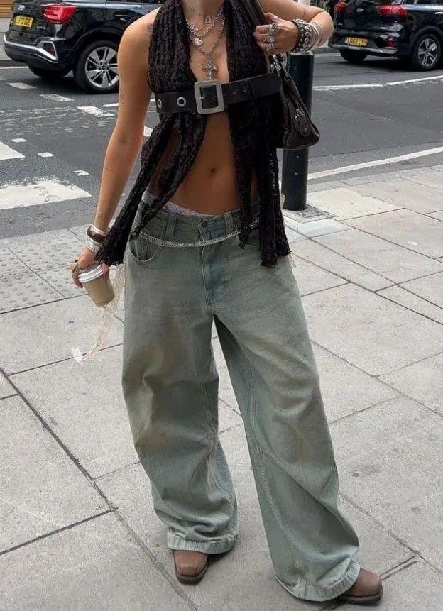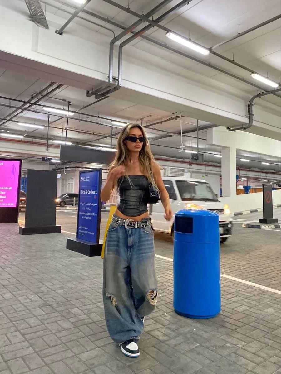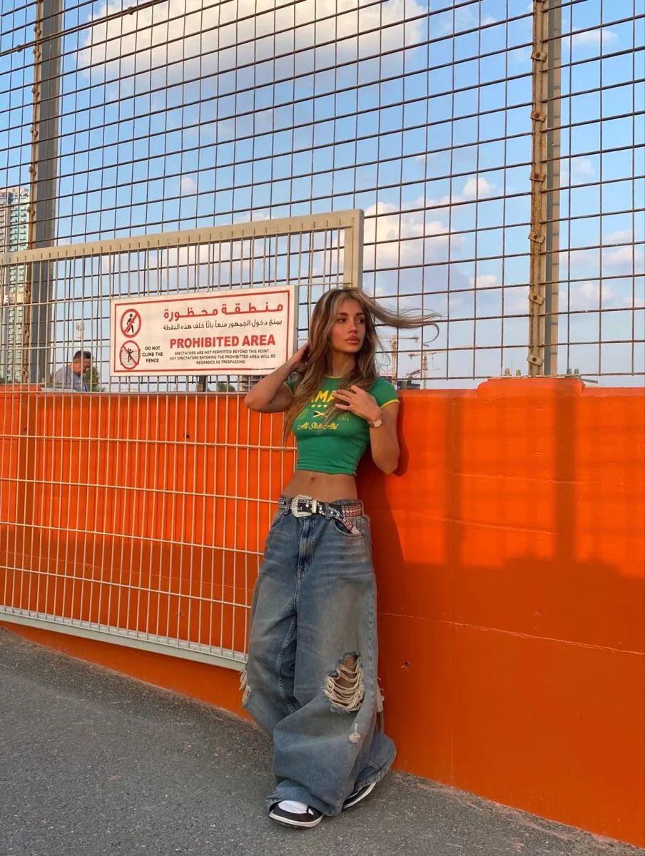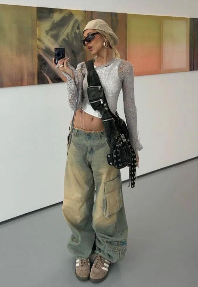 oversize宽松肥大的阔腿牛仔裤,美式高街感直接拉满,裤脚部分堆积有着莫名的不失精致的"邋遢"感。