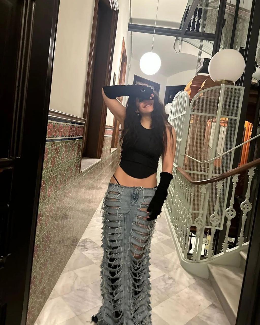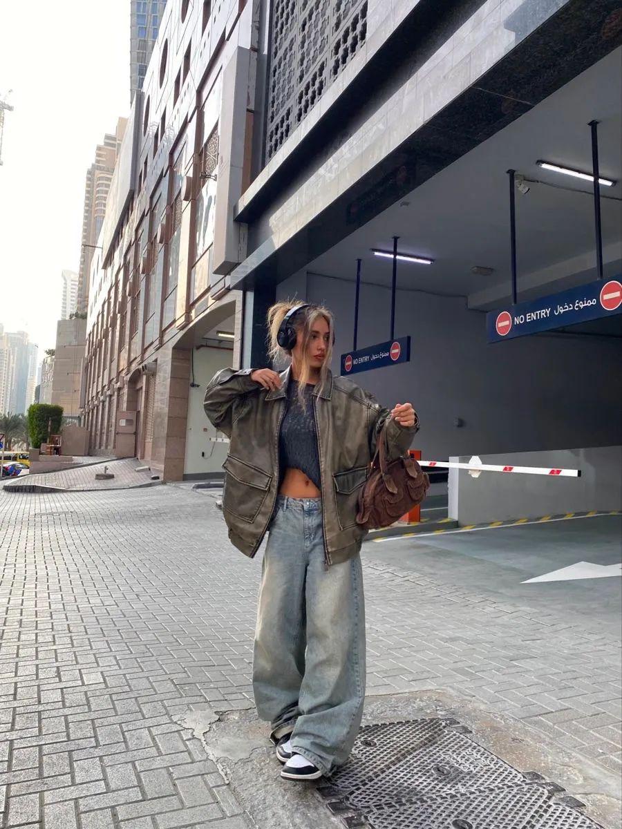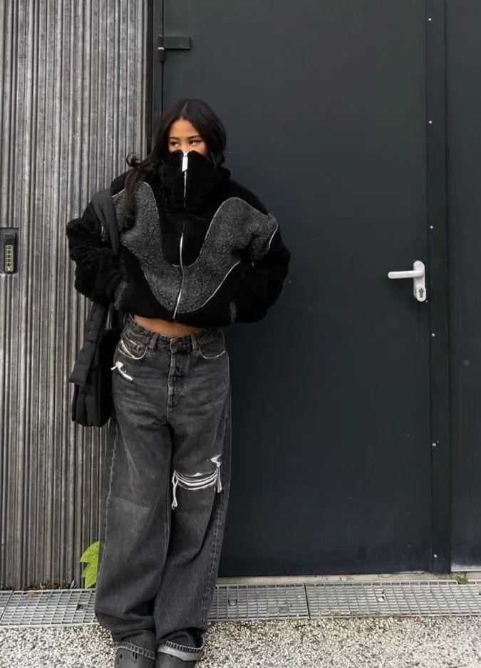 oversize宽松肥大的阔腿牛仔裤,美式高街感直接拉满,裤脚部分堆积有着莫名的不失精致的"邋遢"感。