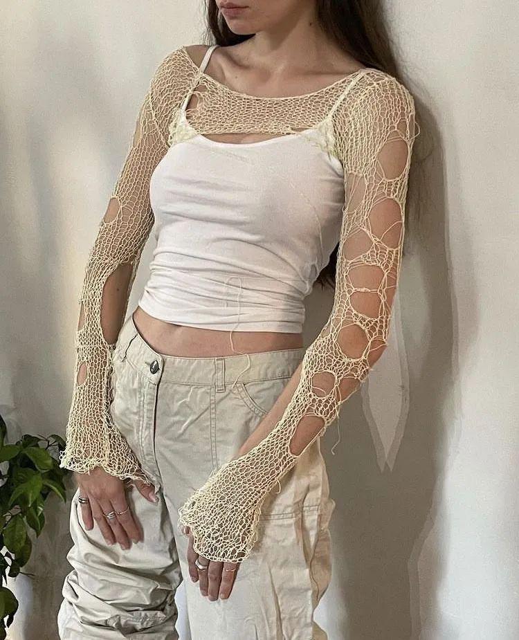 清爽解腻的渔网粗织,杂乱颓废中有着清凉透肤的呼吸感,叠穿背心更有层次,既遮肉又能体现慵懒休闲的魅力。