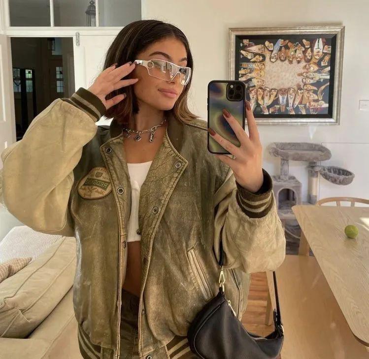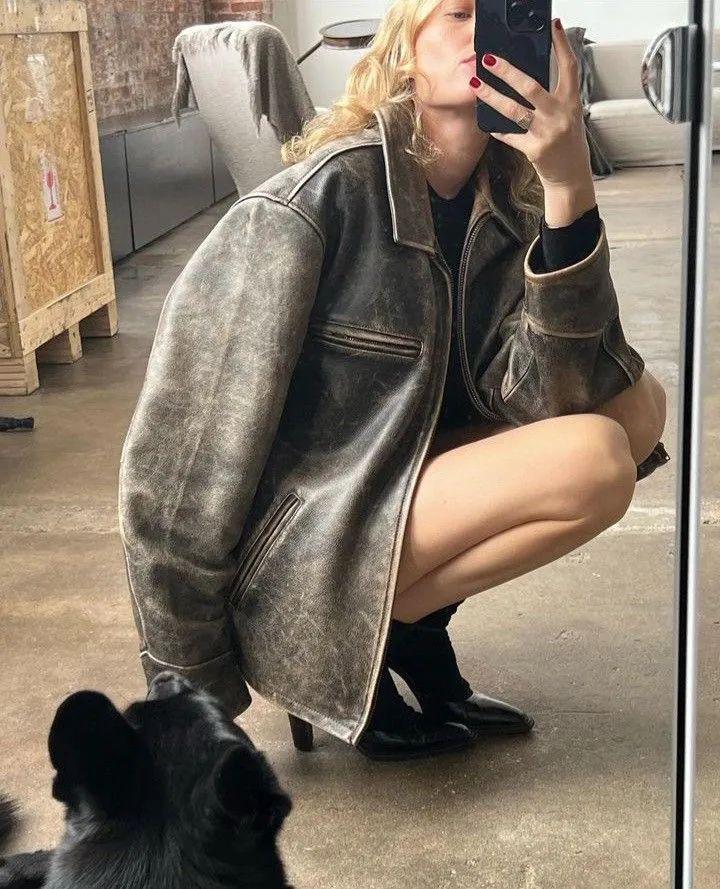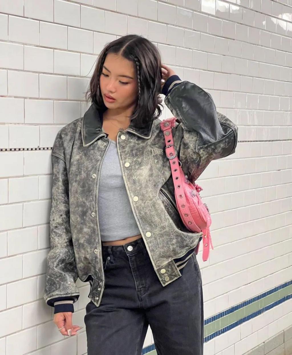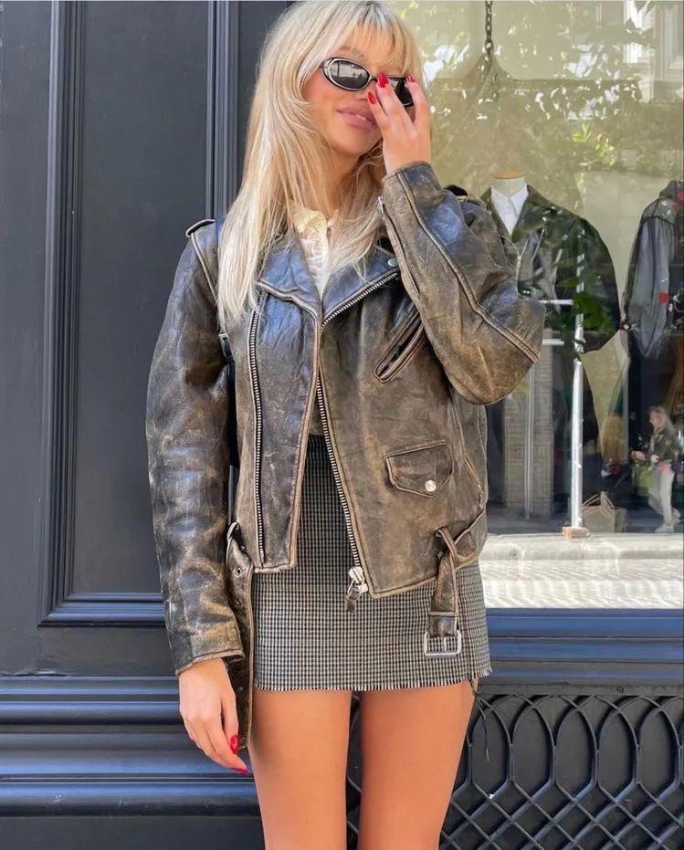 春天正当时,选一款做旧机车皮衣兼具了现代元素和复古质感,经过岁月沉淀,未经修饰的旧旧痕迹,反而展现一种随性的美感,有着刚柔并济感的穿搭。