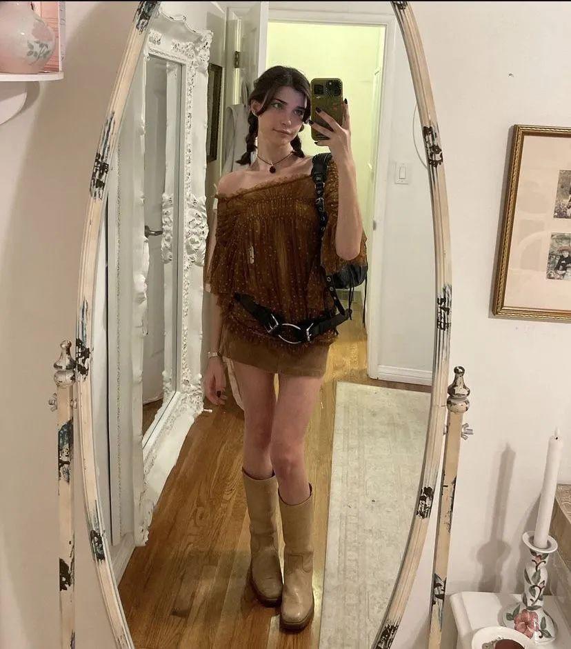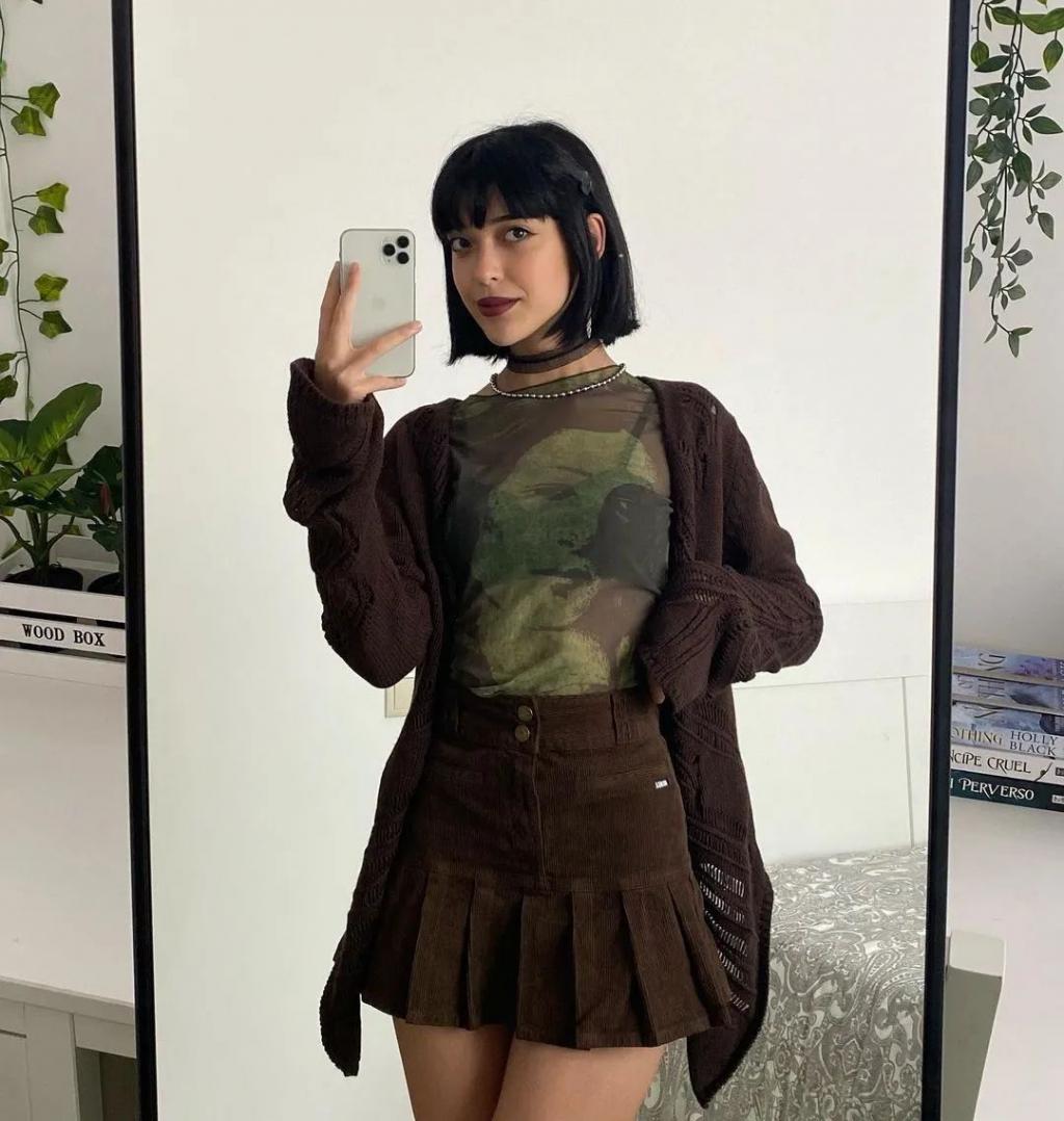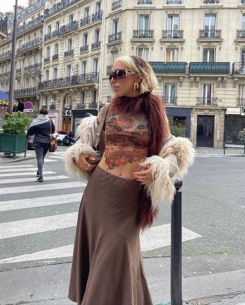 整体土色系的大地色调等都是废土风的标志性元素,将大地色系与薄纱、皮草、丝绸等不同材质的混搭,形成独特的质感,搭配日常出门也可以穿的造型,拽美十足。