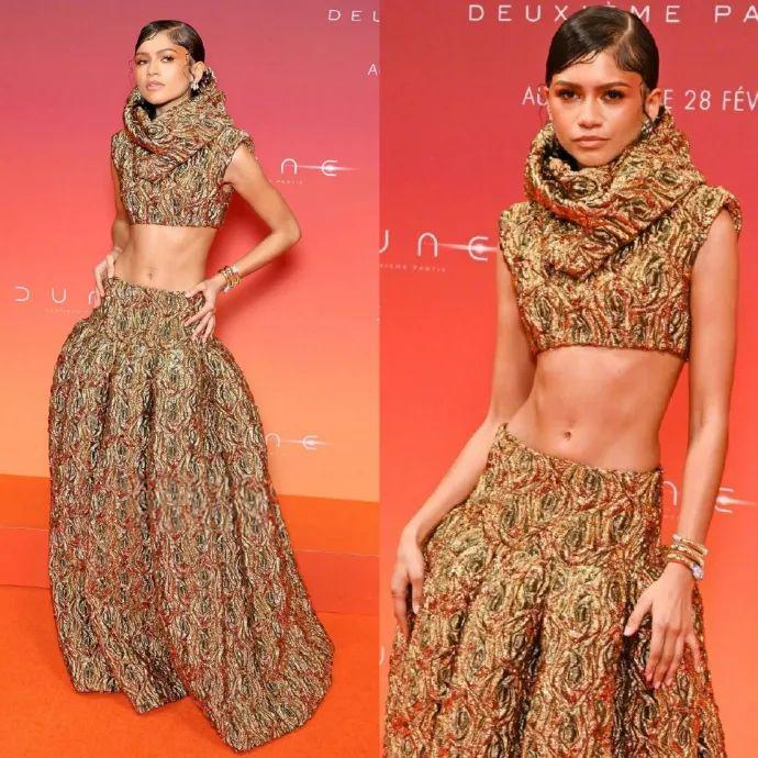Zendaya在《沙丘2》宣传期的红毯也不偏离主题,赞姐每次的造型都会让人眼前一亮,科技感、大地色系、未来主义、绳带缠绕,把电影风格拿捏得很准确!