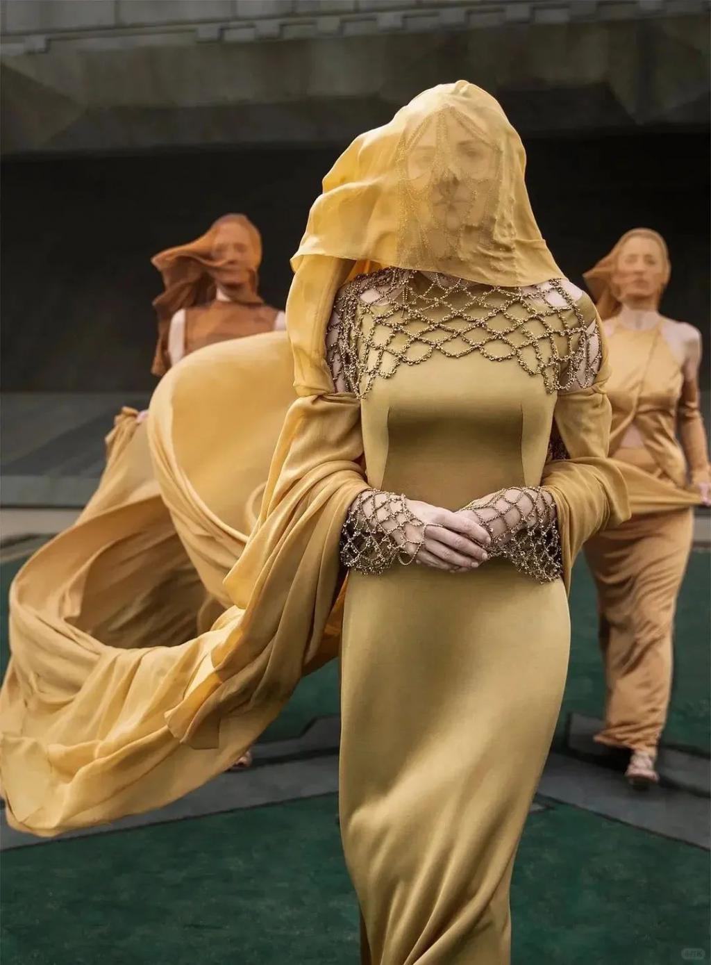 女主杰西卡夫人的沙色定制长袍,灵感来自于上个世纪的Balenciaga,礼服上的链条用纯手工制作,耗费数月,被设计师称为"有史以来最昂贵的服装",是具有未来主义及宗教神圣感的服饰。