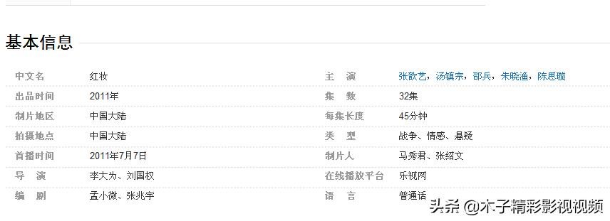 《红妆》是由孟小微、张兆宇编剧,李大为执导,张歆艺、汤镇宗、朱晓渔、邵兵等主演的抗战剧。2011年7月7日于广州电视台综合频道首播,7月20日在辽宁、陕西卫视上星播出 。