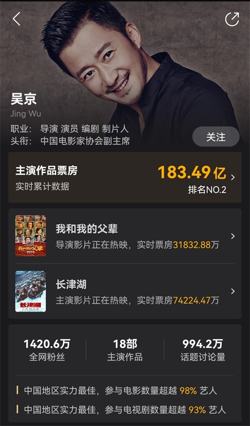目前,吴京参与执导的电影《我和我的父辈》和参与主演的电影《长津湖》正在热映中,猫眼评分均已达到9.5。其中,《我和我的父辈》累计票房3.19亿,《长津湖》累计票房7.44亿。