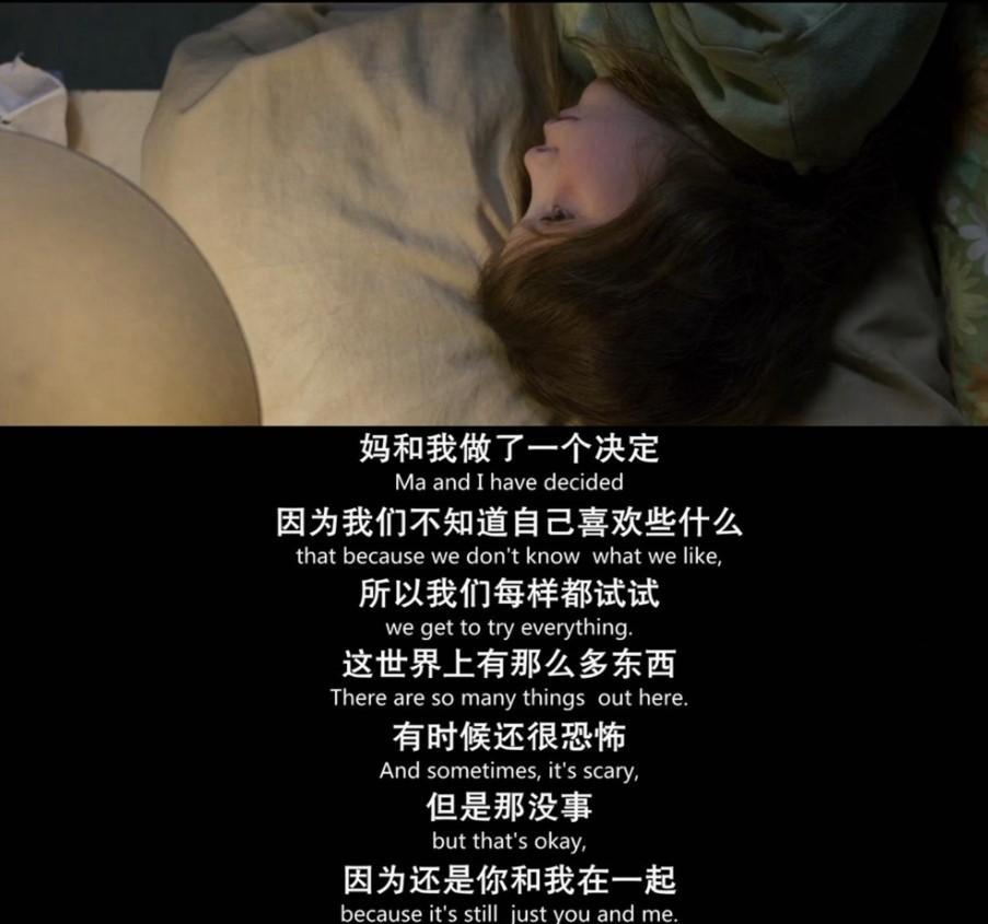 女主看着自己的孩子一天天长大,开始觉得不想要自己的孩子和自己一样,后来的人生只能在这个房间里度过,于是策划逃走,最终他们成功逃脱。在孩子眼中,外面的世界就是一张白纸,面对他的还要有很多很多,但是在10屏幕的屋子内生活的他,也是快乐的,因为作为母亲的女主,没有把仇恨带给他,只把快乐带给他。
