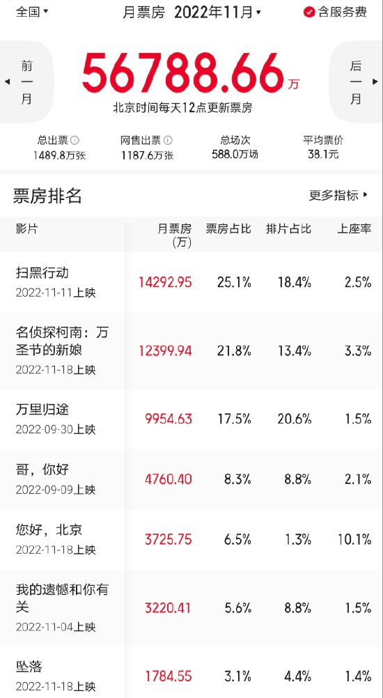 2025年11月全国电影总票房5.68亿元,较去年同期的18.73亿元下降了70%,票房冠亚军分别是《扫黑行动》和《名侦探柯南:万圣节的新娘》,全国影院营业率跌到了36%。