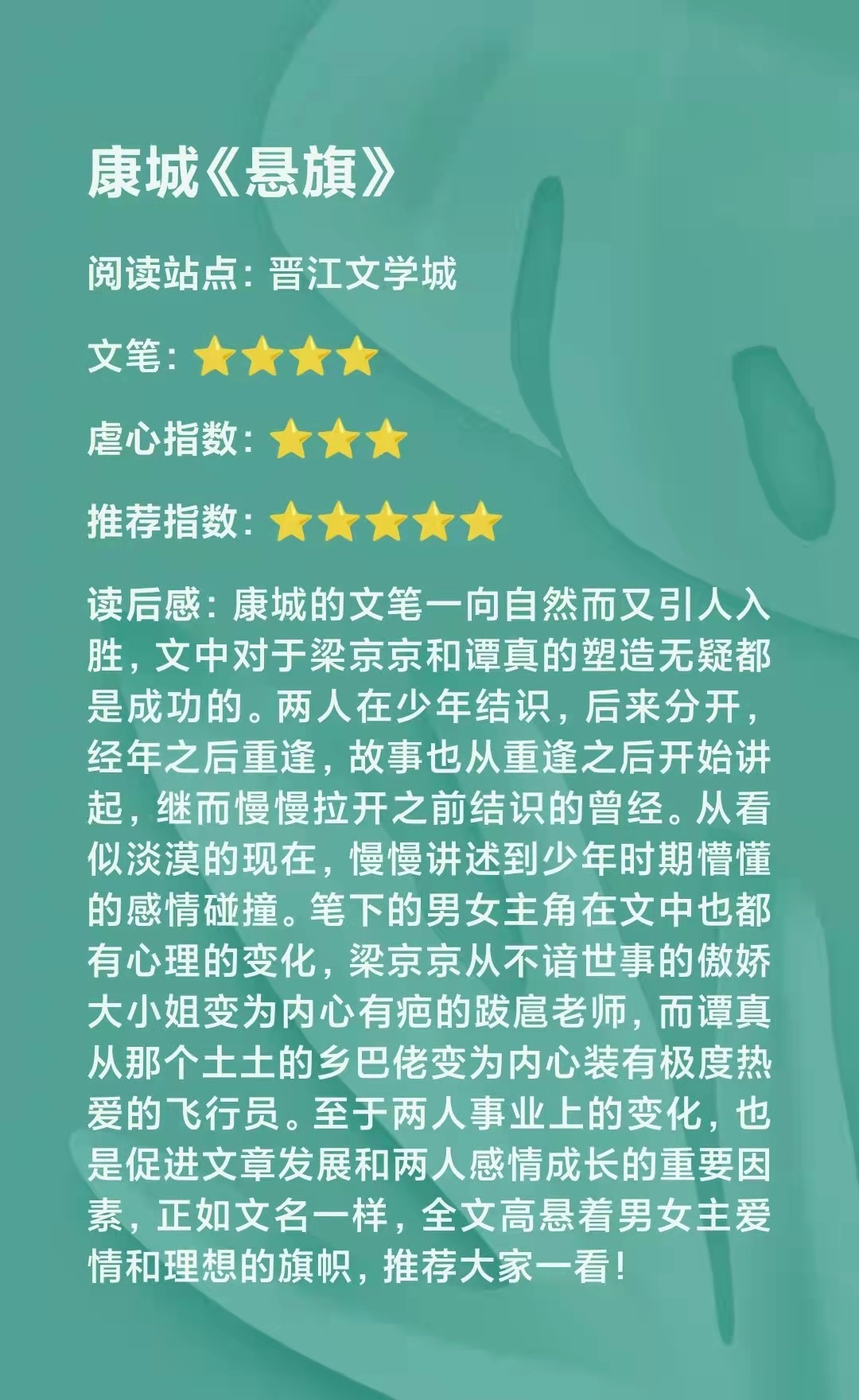 康城的文笔一向自然而又引人入胜,文中对于梁京京和谭真的塑造无疑都是成功的。两人在少年结识,后来分开,经年之后重逢,故事也从重逢之后开始讲起,继而慢慢拉开之前结识的曾经。从看似淡漠的现在,慢慢讲述到少年时期懵懂的感情碰撞。笔下的男女主角在文中也都有心理的变化,梁京京从不谙世事的傲娇大小姐变为内心有疤的跋扈老师,而谭真从那个土土的乡巴佬变为内心装有极度热爱的飞行员。至于两人事业上的变化,也是促进文章发展和两人感情成长的重要因素,正如文名一样,全文高悬着男女主爱情和理想的旗帜,推荐大家一看!