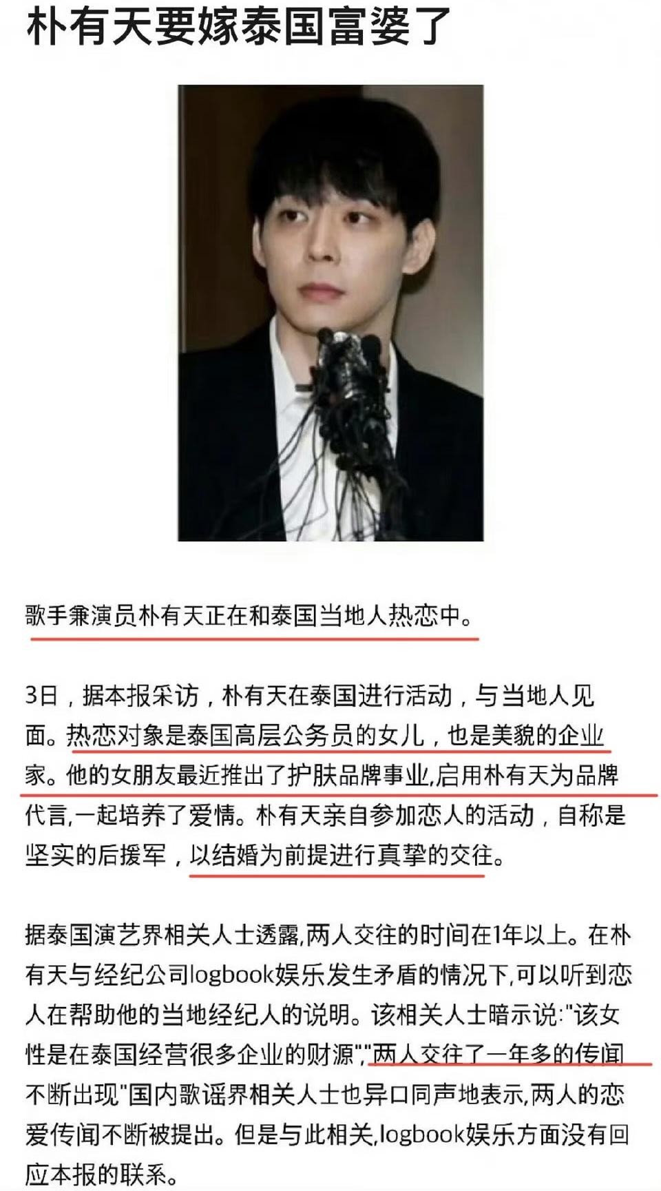 吓人!韩星朴有天被曝和泰国副总女儿交往中