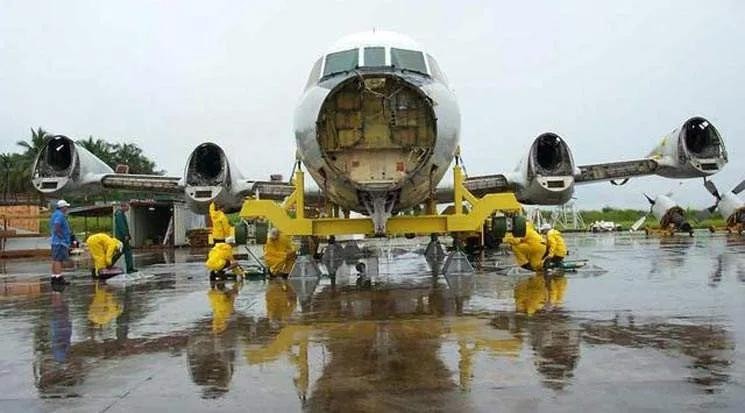 王伟飞机的尾部被美军侦察机螺旋桨切的四分五裂,像纸片一样到处飞在空中。而美军侦察机的前部机头受损。