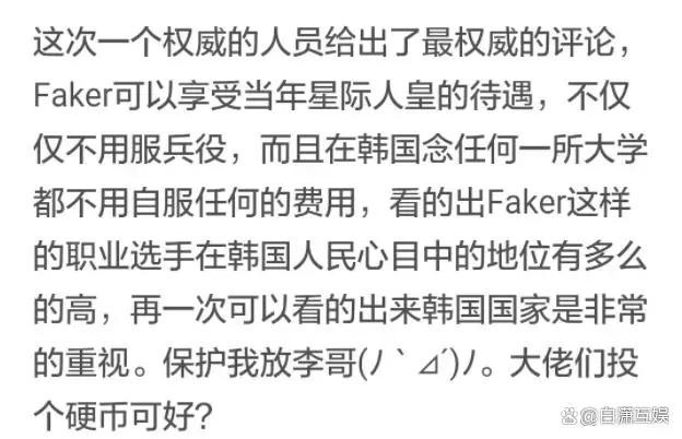 从这一点来看,为什么有人呼吁FAKER免服兵役就可以理解了。 但我们不能简单地依靠他的政绩来规避法律,更不能把他当作优待的对象。 军队是国家安全和利益的重要组成部分,兵役制度旨在确保公平、平等。