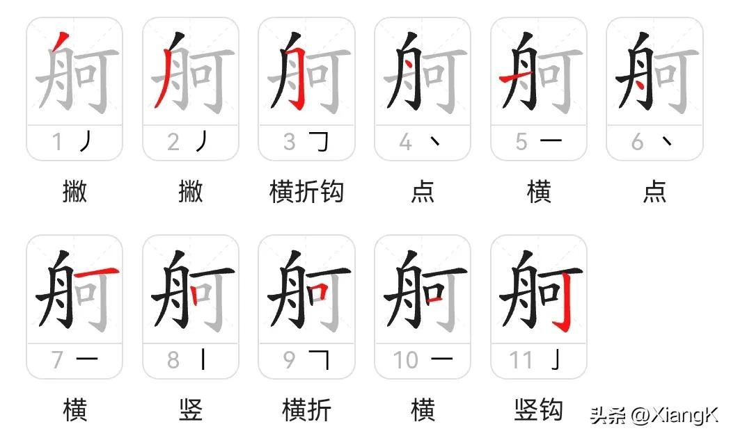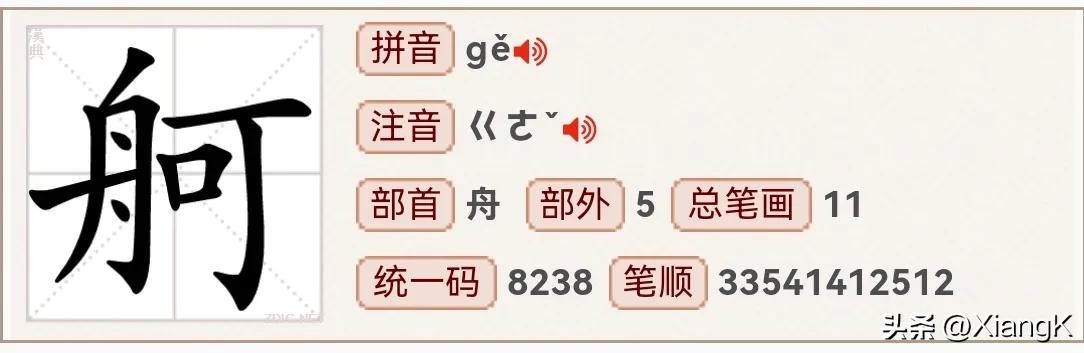 读音为“gě”,同音字“葛”,部首为“舟”,总笔画11,左右结构。