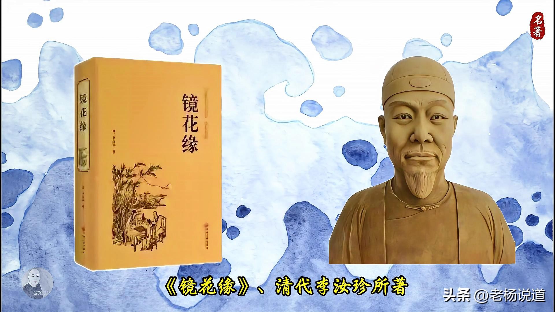 10.《镜花缘》、清代李汝珍所著、是一部神魔爱情小说共100回、以丰富的想象幽默的笔调展示万般世相、讲述了唐敖、多九公等人乘船在海外游历的故事、曰:“桃花流水杳然去、朗月清风到处游”。