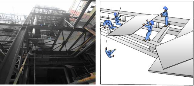 某钢厂2名作业人员站在空气预热器上部钢结构上,在进行起重挂钩作业时,失去平衡同时跌落,1人死亡。