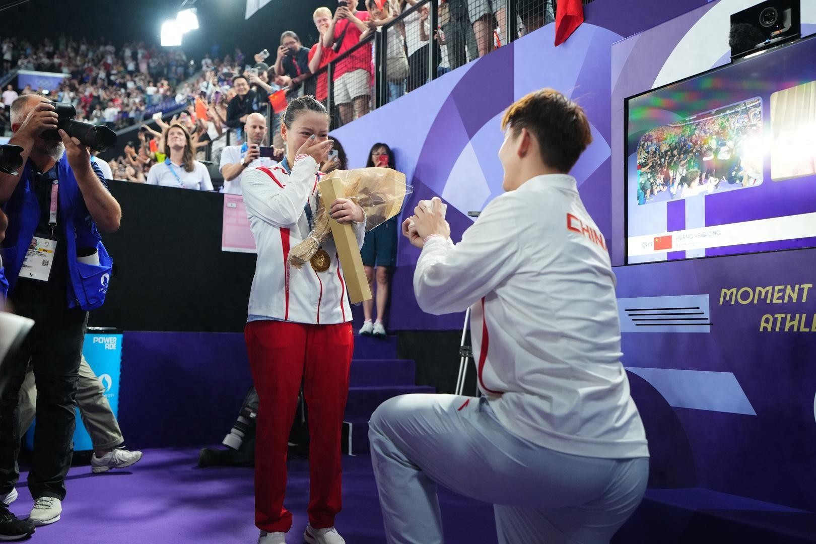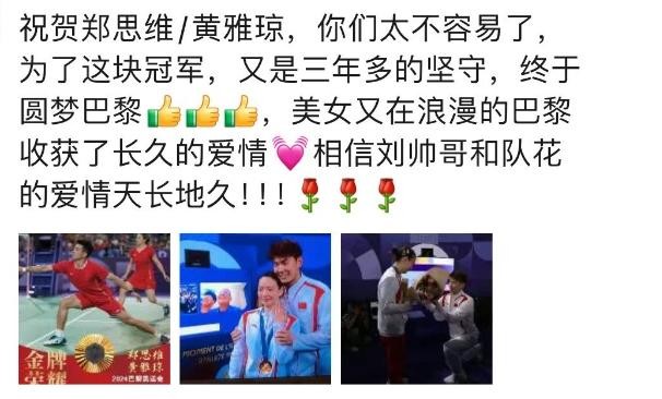 在巴黎奥运会的赛场上,不仅仅是为了金牌的争夺,更是浪漫求婚的舞台!昨晚的比赛中,黄雅琼在与搭档郑思维夺得混双金牌后,收获了另一份巨大的惊喜——男友刘雨辰的浪漫求婚。