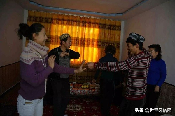 节日的第一天,首先给在近期内发生过丧葬等家难的左邻右舍或乡亲拜节,表示慰问;其次是给夫妻双方的长辈拜节;再次,就是给近邻和长者拜。其它的拜节活动往往是三五成群,男女分别进行(在维吾尔民间礼俗中,一般是不允许男女混杂的)。