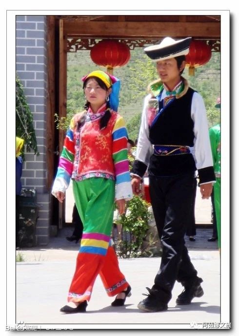 未婚姑娘习以两鬓梳小辫,中间梳一条辫,三条辫子合辫在背后,用绯红头绳扎紧,系一海螺圆片。少女额前戴的额带叫“箍儿”,白布绣花做成,宽二寸,长及两耳,上沿连几束彩线短穗和几个小铃铛。有的姑娘头戴一条绣花头巾。其裤腿套一尺长的红色“帖弯”,在膝下方用白色布条将“帖弯”与裤腿相连,使其经纬分明。发式、“帖弯”颜色和额带的不同,常是区别已婚或未婚妇女的标志。