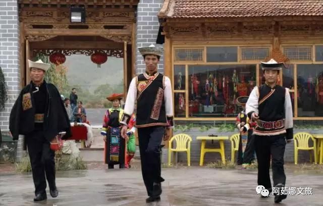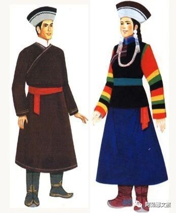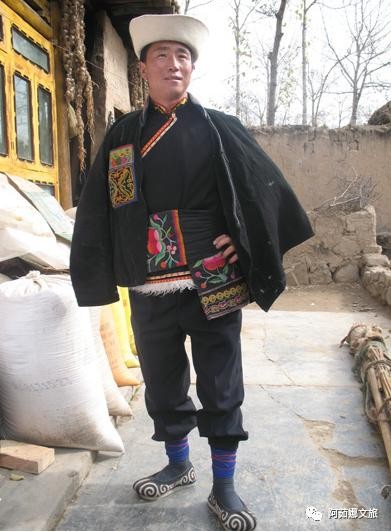 老年男子多戴礼帽。冬天戴皮帽,即用毛蓝布缝成喇叭口,喇叭口内缝以羊羔皮,可翻上或放下。帽顶上加有一颗核桃大的红绿线顶子。穿小领斜襟长袍,外套黑色坎肩,系黑色腰带,脚穿白袜黑鞋。