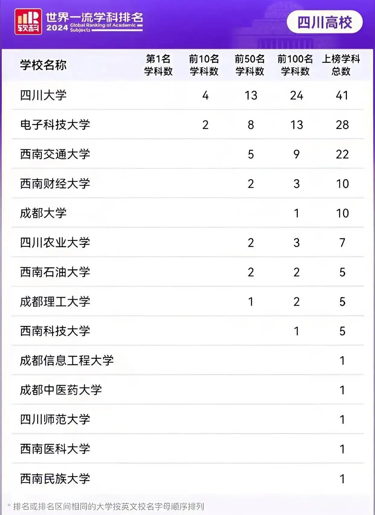 2024年软科世界一流学科排名中,四川有14所高校的138个学科上榜.具体情况如下: