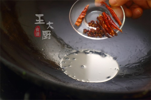 2、起锅烧油,将准备好的干辣椒、花椒放在锅中,进行煸炒。