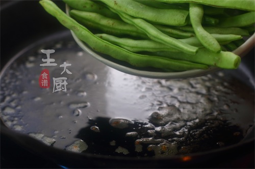 1、平底锅烧油,将准备好的豆角放在锅中,进行简单的煸炒,之后盛出。