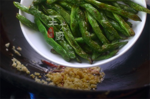 4、将之前干煸过的豆角放在锅中,进行翻炒。