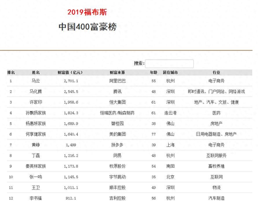 福布斯发布2019中国富豪榜:马云马化腾名列前二