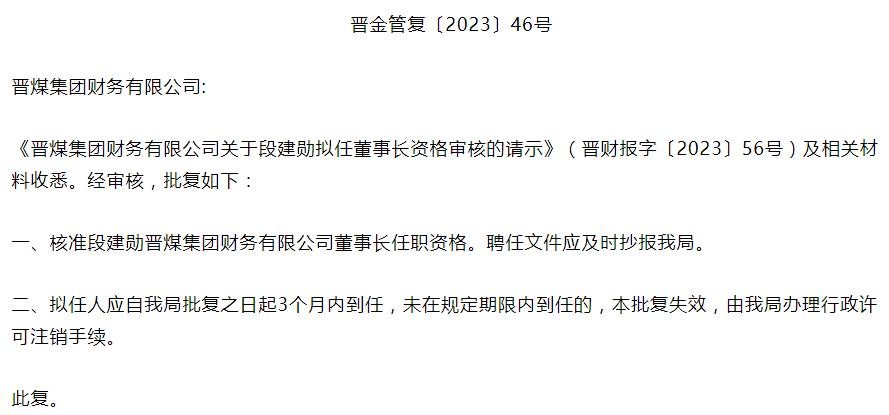 9月19日,山西银保监局核准段建勋晋煤集团财务有限公司董事长任职资格。