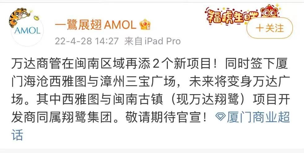 4月28日,根据知名博主@一鷺展翅AMOL爆料:万达商管在闽南区域再添2个新项目!同时签下厦门海沧西雅图与漳州三宝广场,未来将变身万达广场。其中西雅图与闽南古镇(现万达翔鹭)项目开发商同属翔鹭集团。敬请期待官宣!