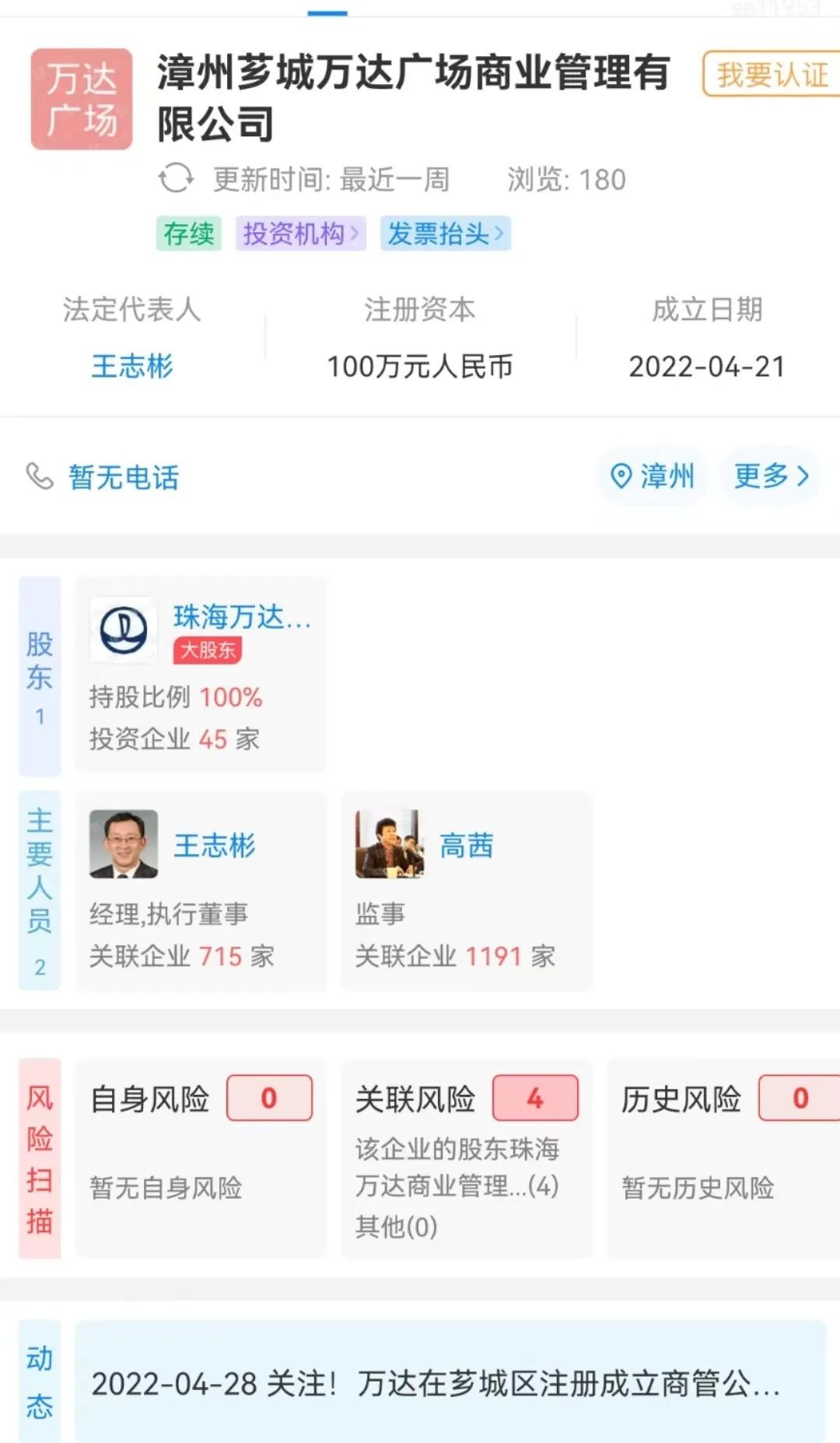据悉, 漳州芗城万达广场商业管理有限公司成立于2022年04月21日,法定代表人为王志彬,注册资本为100万元人民币,经营范围包含:一般项目:商业综合体管理服务;物业管理等。