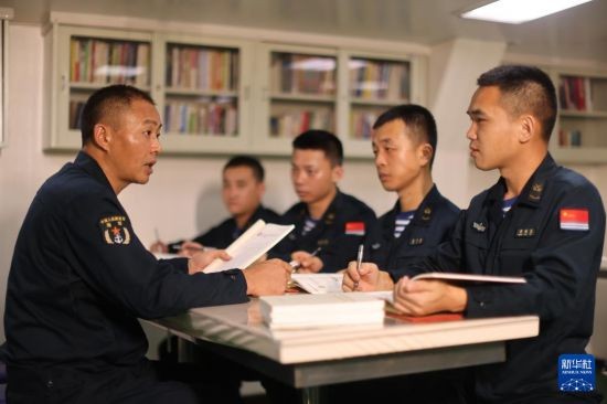海军导弹驱逐舰海口舰技师周帅(右)出海期间向班成员部署基础训练任务(2024年6月25日摄)。新华社发(杨云翔 摄)