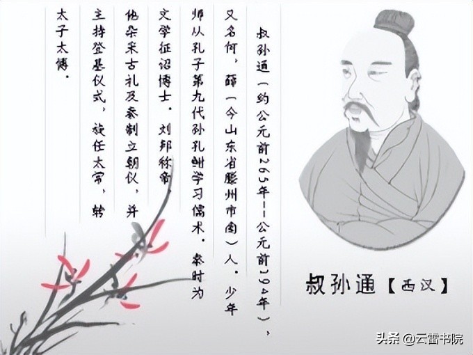 西汉时,汉高祖刘邦委托叔孙通制定礼仪,规范群臣的行为。叔孙通在沿袭前朝礼仪的基础上,征召三十多名儒生共同拟定朝堂仪式,并进行了反复演练。在朝岁大典进行的时候,司仪官引导文武百官进入大殿,按照秩序依次站立,等到皇帝上朝,所有官员毕恭毕敬地向皇帝施礼道贺。从朝见到宴会结束,整个大殿肃穆庄重,秩序严谨,各安其位。刘邦夸赞叔孙通道:“先生说得对,礼法是能够教化人啊!”