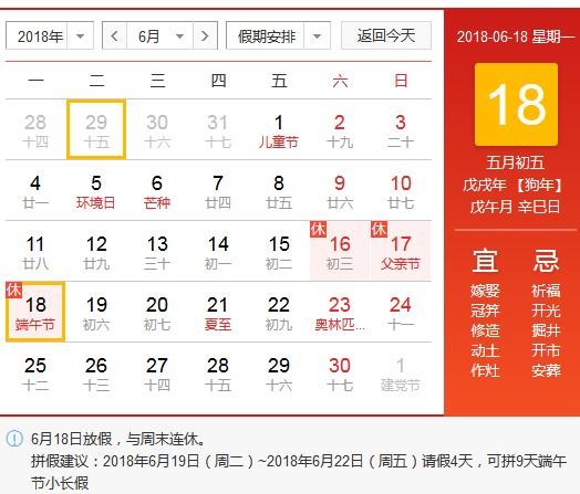 今年的端午节时间:2018年6月18日 星期一
