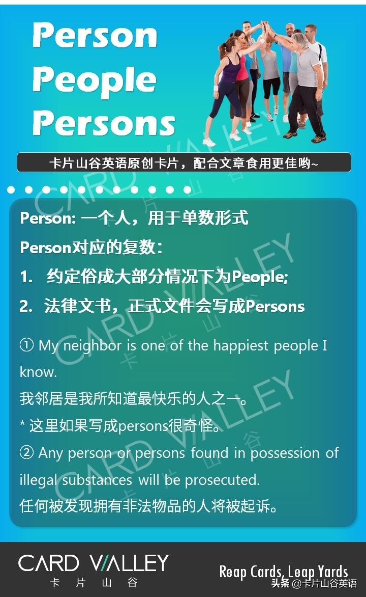 ① Person表示一个独立的人(individual),在通常情况下,大部分日常场景中person的复数形式是people。