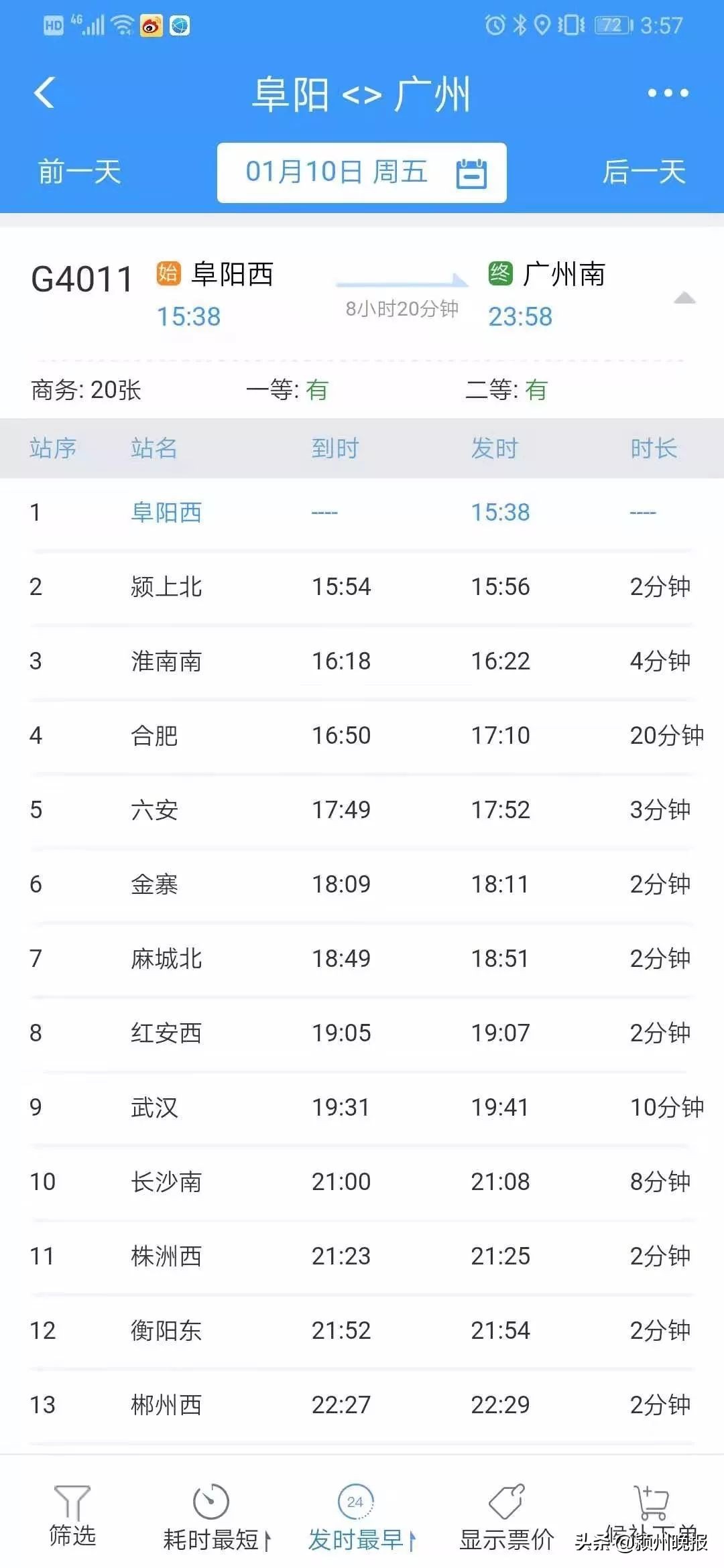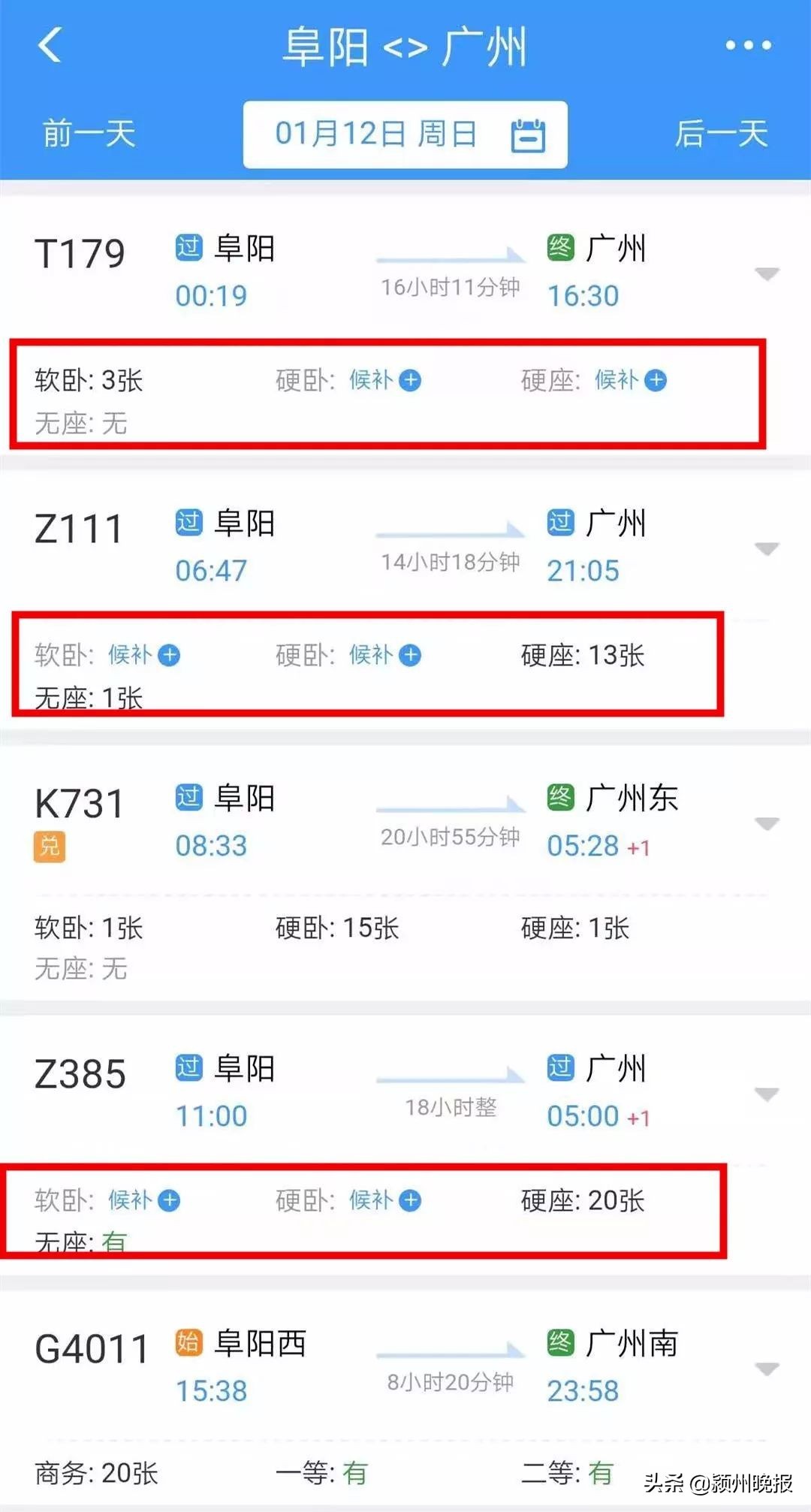 12306上已经可以查到2020年1月10日从阜阳始发至武汉、长沙、广州的高铁G4011开始售票