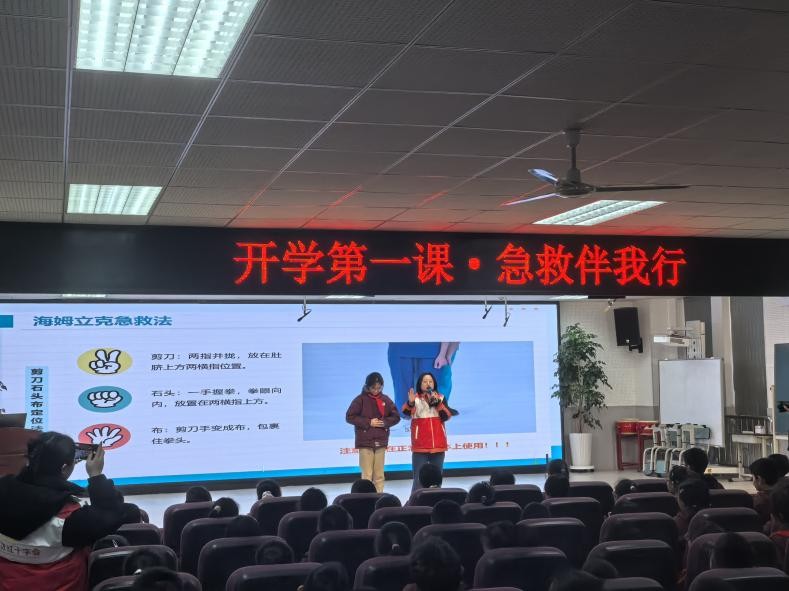 在常见伤害处置环节,医护人员不仅详细介绍了骨折、扭伤、鼻出血等常见伤害的正确处理方法,还邀请学生上台亲身实践海姆立克急救法,通过互动教学,让学生在实践中巩固急救技能。