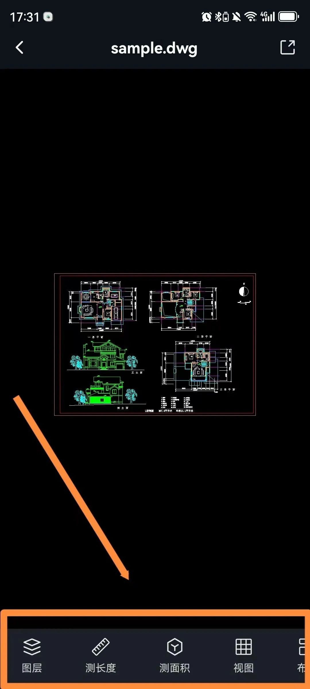 CAD图纸文件打开后,在页面下方可以看到多种操作工具:图层、测长度、测面积、视图等等;