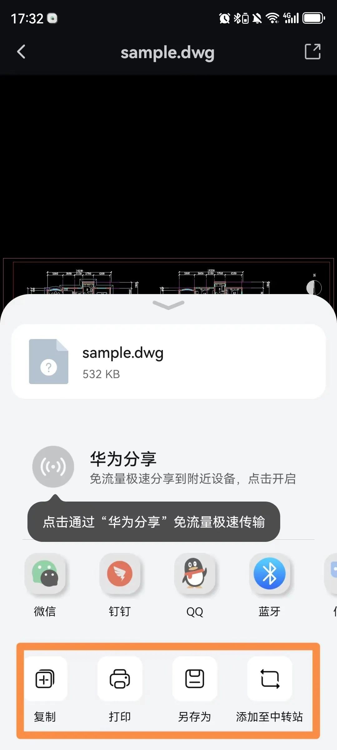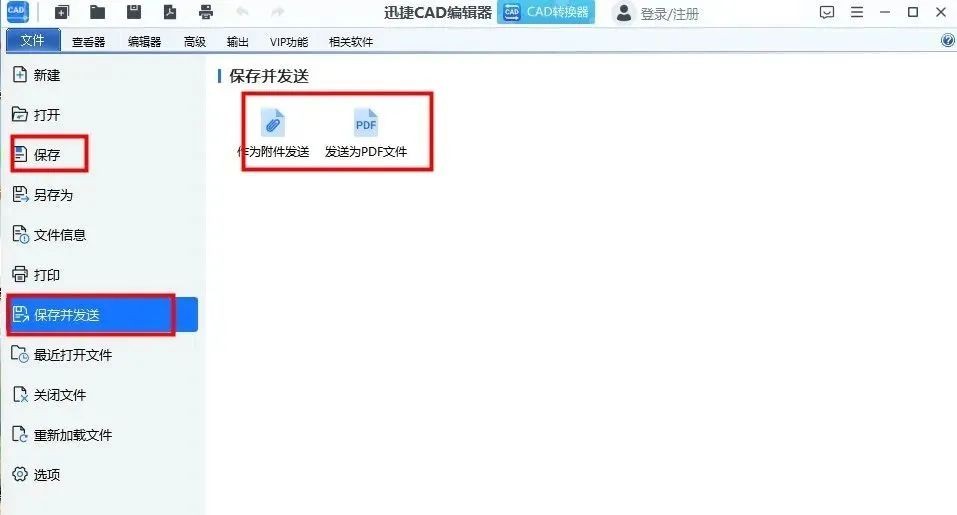 最后点击【文件】保存,也可点击【保存并发送】,编辑后的CAD图纸以附件、PDF的形式发送。