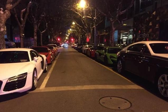 看到这条单轨两旁都停满了火车,奥迪R8和劳斯莱斯幻影可能会迟到,几乎停在斑马线上。奥迪R8后面是红色法拉利458,劳斯莱斯后面是绿色迈凯轮。原来这条路很窄。不知道其他司机经过时有何感想。不小心握方向盘的后果不堪设想。