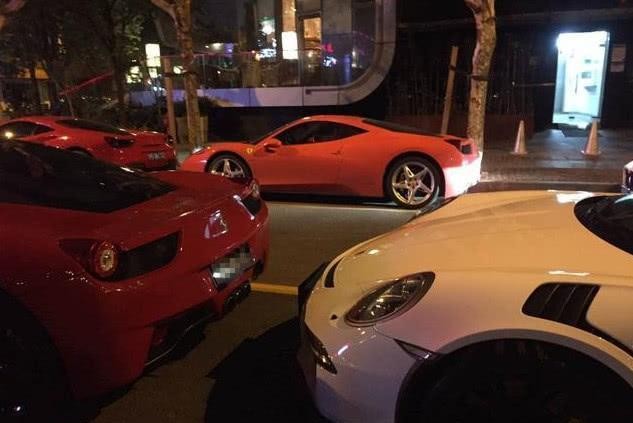 整条街上停放最多的法拉利458,其价值可超过400万。458后面的白色是保时捷911GT3RS。这辆车是保时捷99系列,继GT3和GT3R(赛车版)之后,在2014年增加的版本,大约300万就能买到。