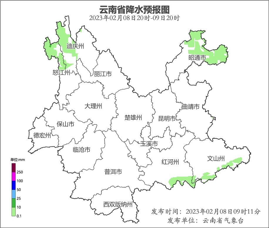 2月8日20时到2月9日20时:昭通北部、文山南部、红河南部、怒江北部、迪庆西部多云间阴有阵雨,其他地区晴。
