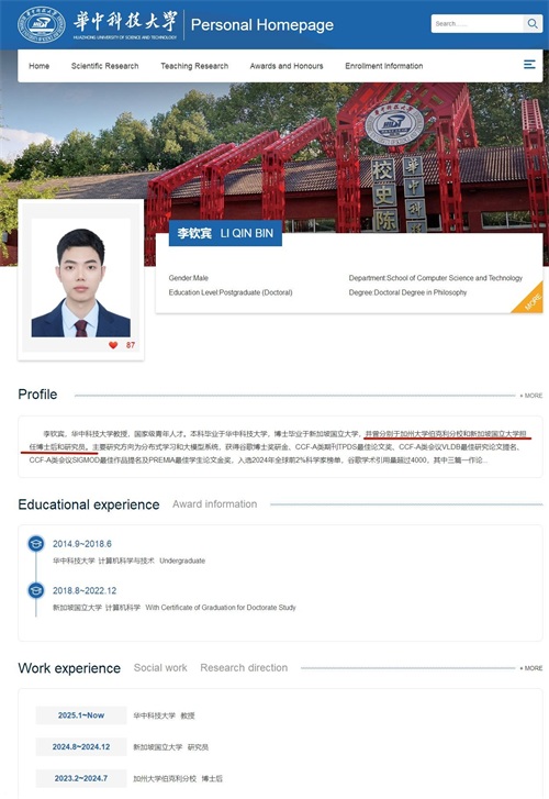 近日,华中科技大学更新教师资料显示,此前担任新加坡国立大学研究员的李钦宾,已于今年1月起,担任华中科技大学计算机科学与技术学院教授、博士生导师。