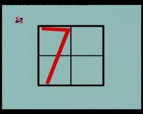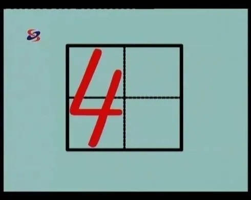 “4”像小旗,从上线的中间起笔,向左斜线到下格,碰左线再折右碰线。第二笔从右上角附近下去,到下面的当中碰线。