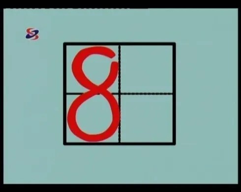 “8”像娃娃。从右上碰线到左线成半圆,拐向右下面成圆碰右线,下线、左线,在向上,在中线以上和原线相交,最后,线到右上角附近稍离起笔处为止,不封口。